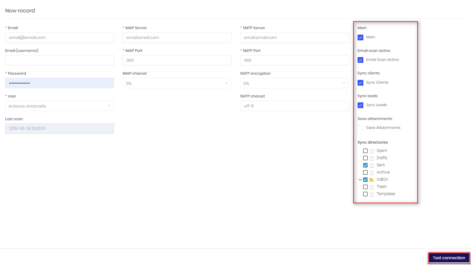 - Enter the settings: Email, Password, IMAP server, IMAP port, IMAP charset, SMTP server, SMTP port, SMTP charset. Only enter Email (username) if it differs from Email. Insert details and press Email scan active. Select Sync clients and/or Sync leads. Below Sync directories you will be able to pick folders for email synchronization.