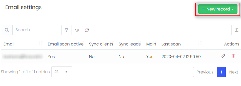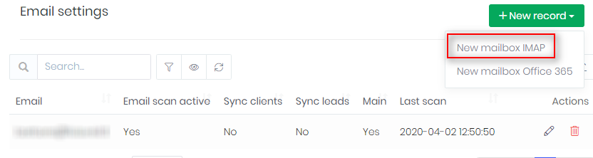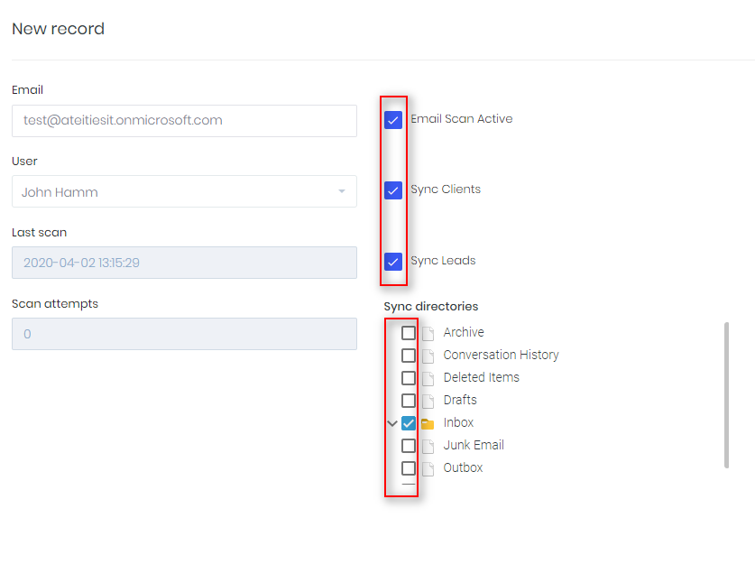 - In the new window, mark Email Scan Active, Sync Clients and/or Sync Leads and mark folders that have to be synched.