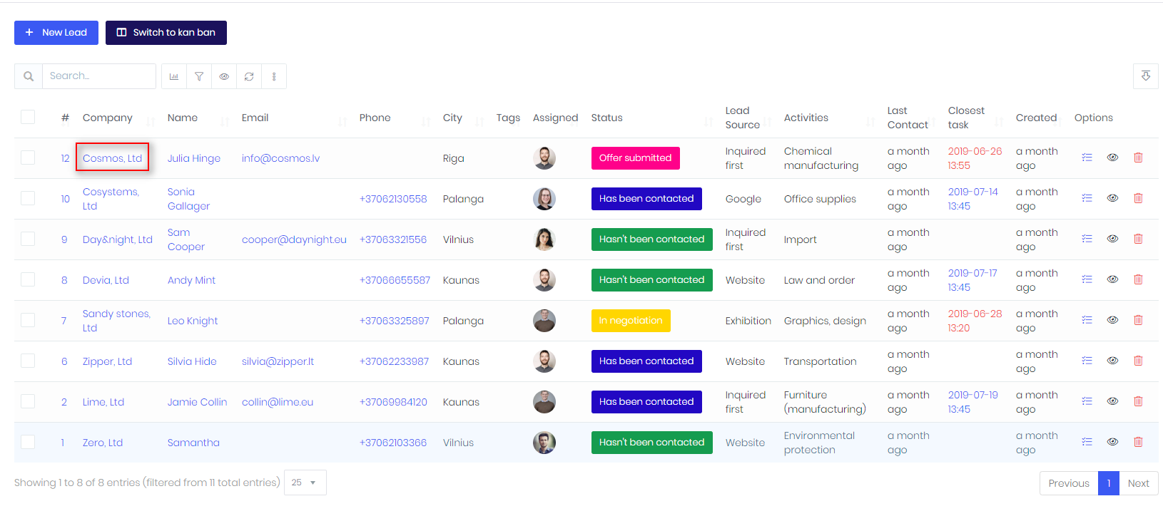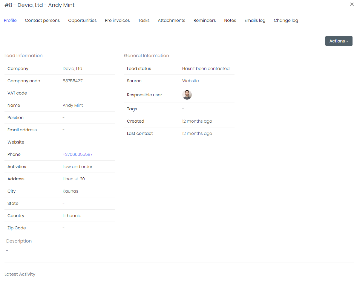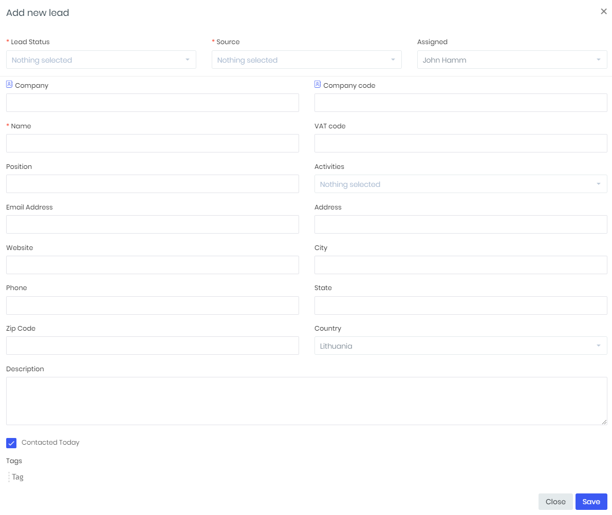 If you select Assign to contact, you will be able to choose from already existing customers to which lead has to be assigned. One customer can have several assigned leads. Lead status will also become Client.