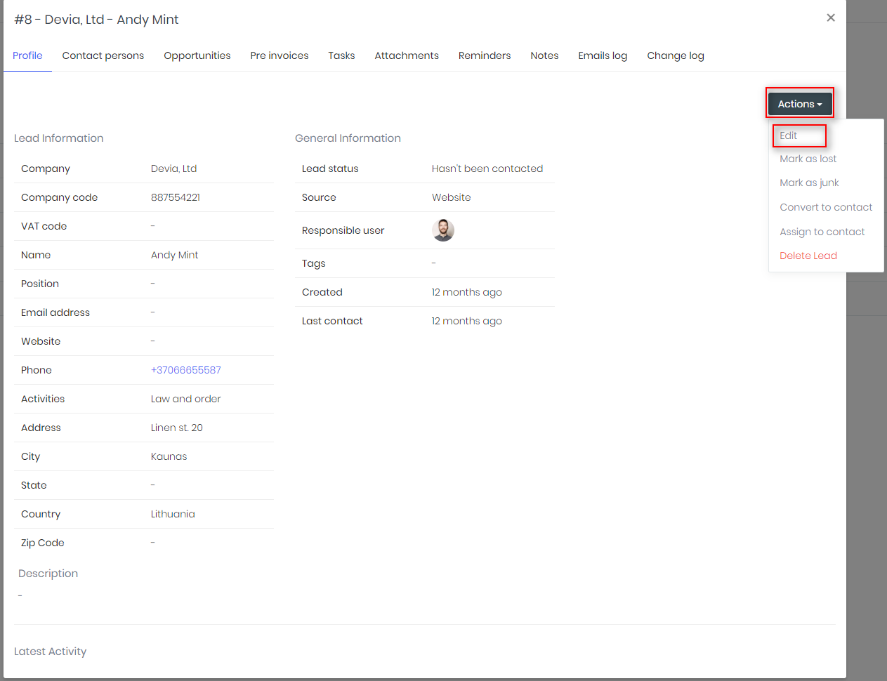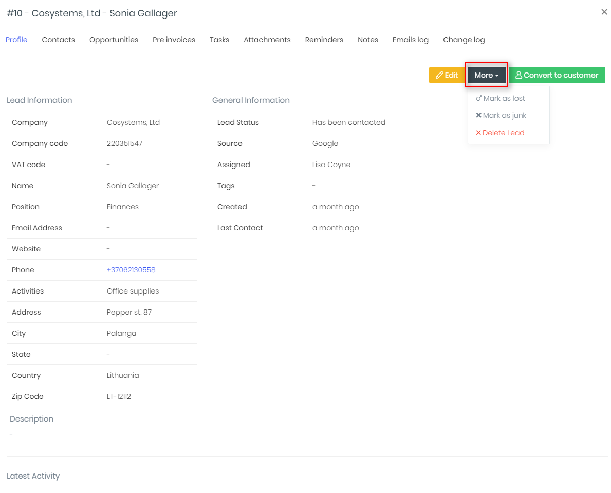 Select Convert to customer if you want to create customer from lead. New client profile will be created in module Customers and potential customer will automatically have lead status Client.If you edit lead status to Client, you will also see an option to convert lead to contact.