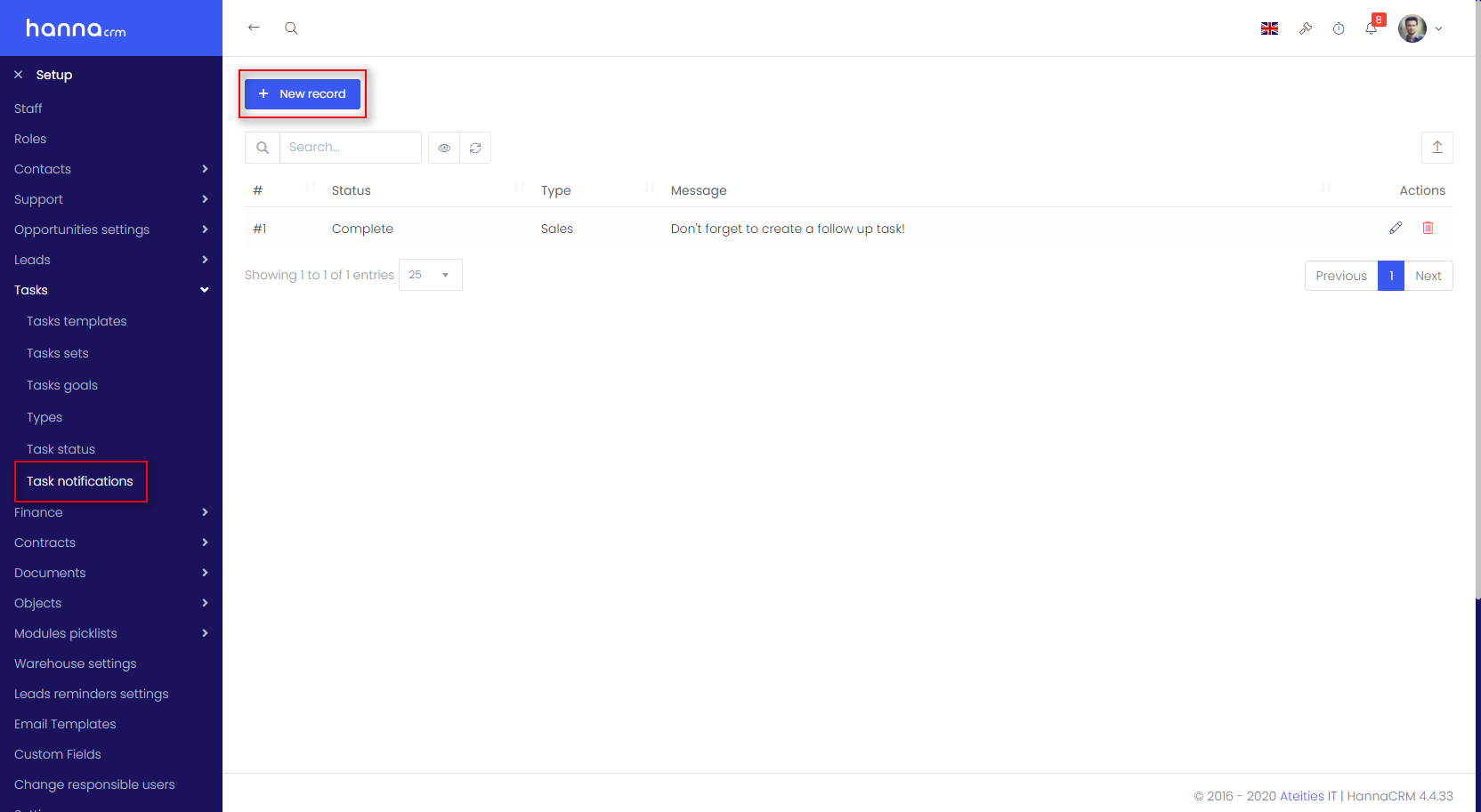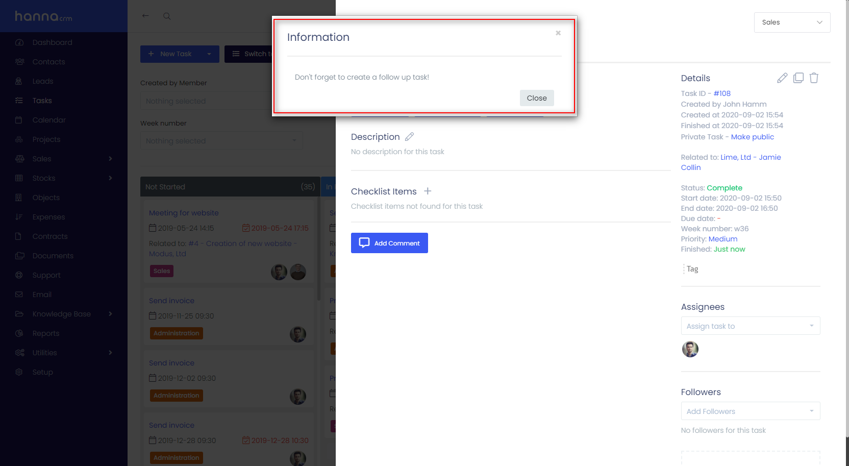 Create task notifications that will be shown after task status is changed. You can relate them to task types. Follow these steps.