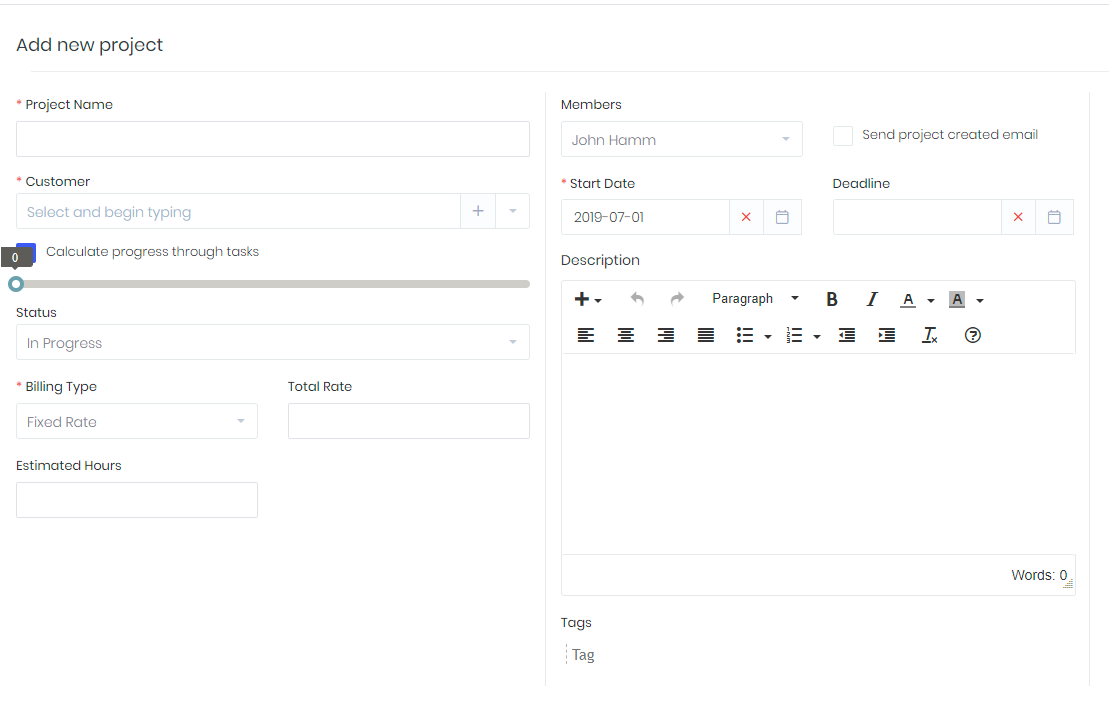 - Project hours – enter hourly rate, the system will automatically multiply project hourly rate with task hours.