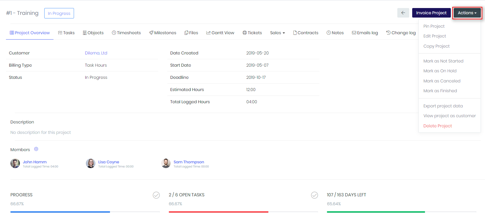 To edit or delete project, use Actions: