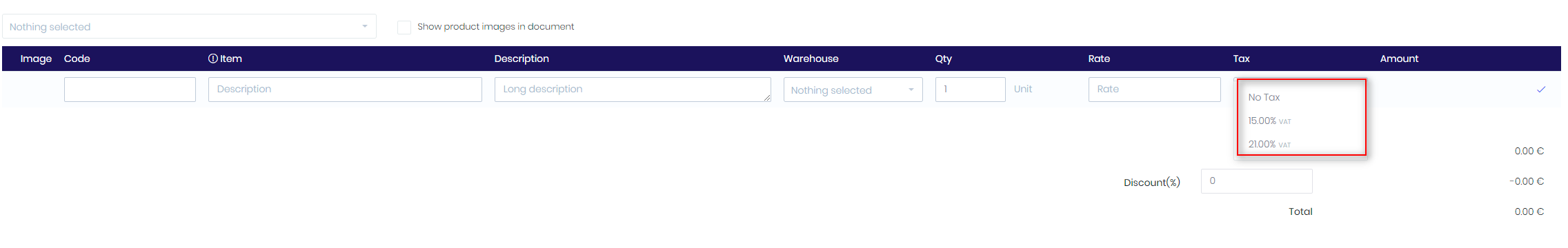 Include tax rates by choosing Setup -> Finance-> Tax rates. Tax rates are selected when indicating VAT: