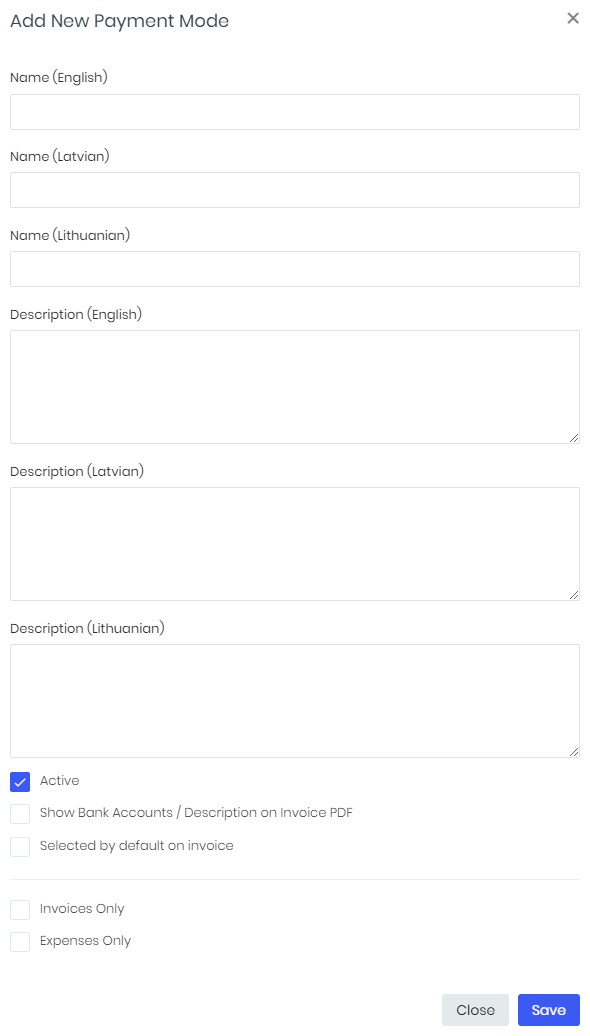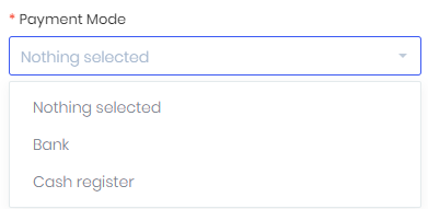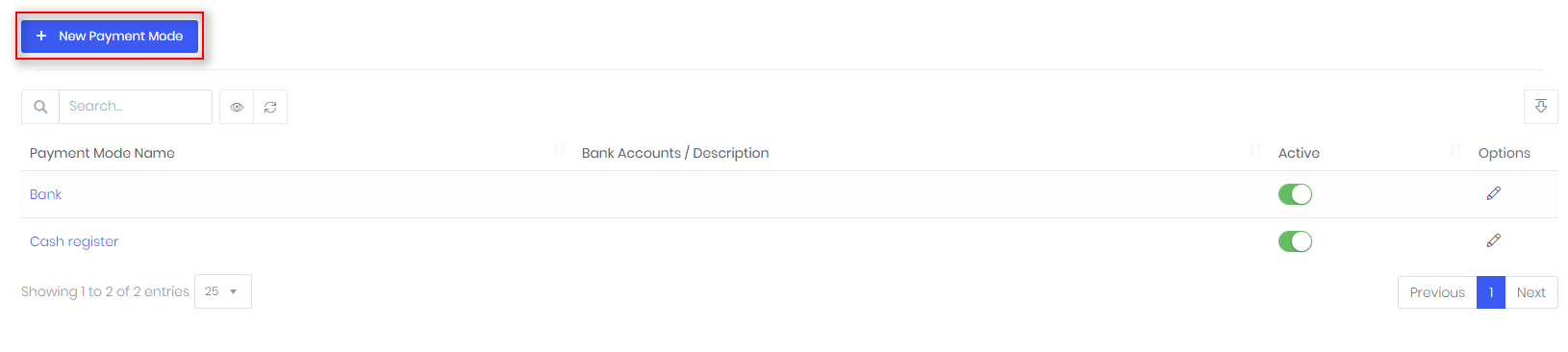 - Go to Setup-> Finance-> Payment modes to create new payment mode. Choose New payment mode.