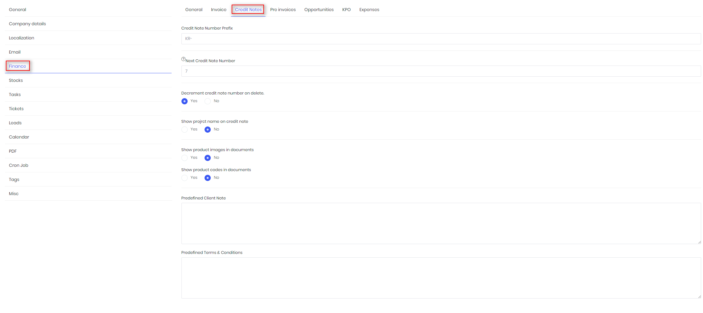 Setup -> Settings -> Finance -> Credit notes – indicate: