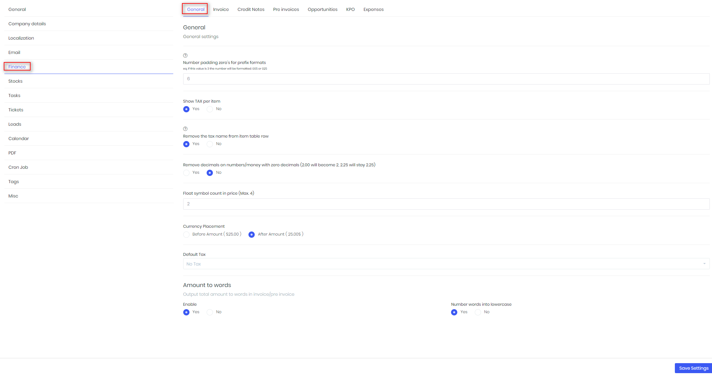 More settings are available on Setup -> Settings -> Finance. Go to Setup -> Settings -> Finance -> General and choose general settings. Indicate: