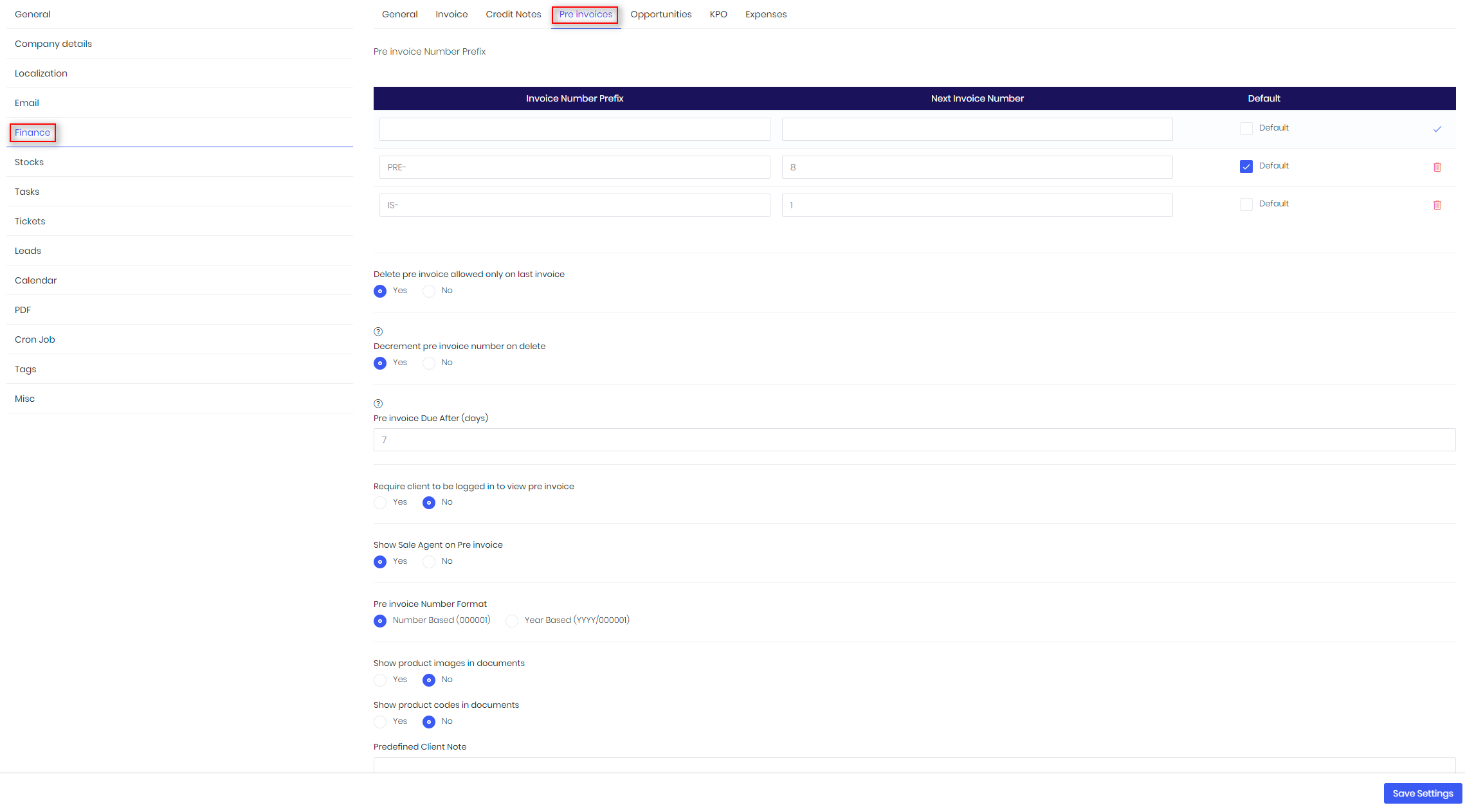 Setup -> Settings -> Finance -> Pre invoices – indicate: