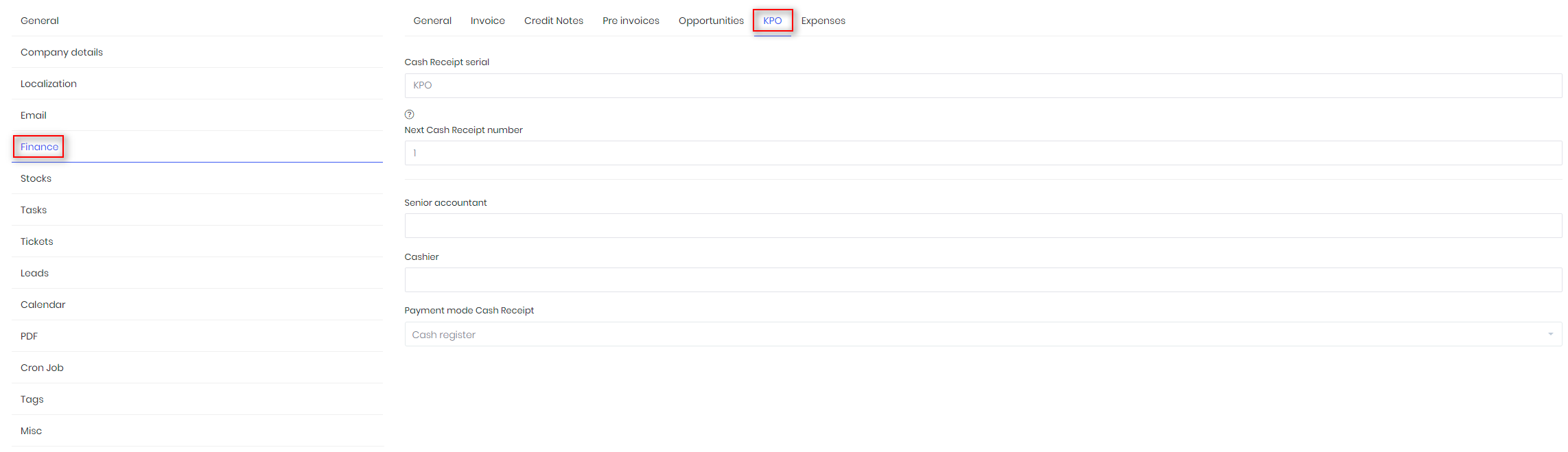 Setup -> Settings -> Finance -> KPO – indicate cash receipt settings.