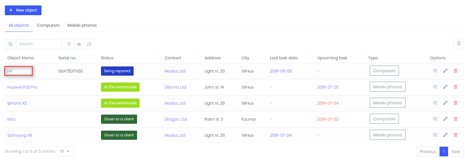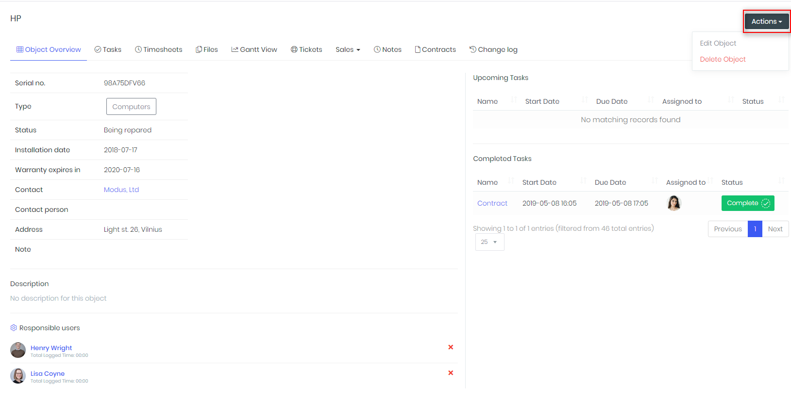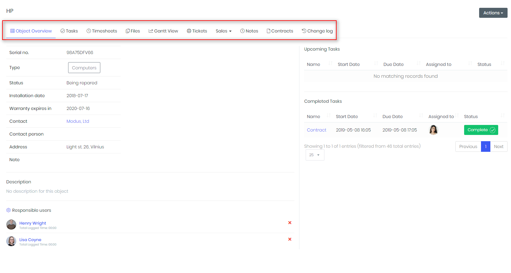 See all the information about the object. On the upper menu you can select to view related tasks, timesheets, files, Gantt view, tickets, sales, notes, contracts and change log.