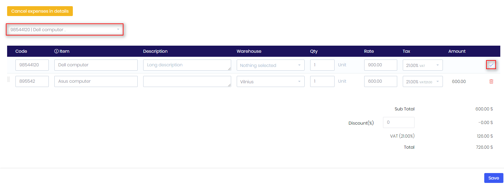 - Insert items and press blue tick: