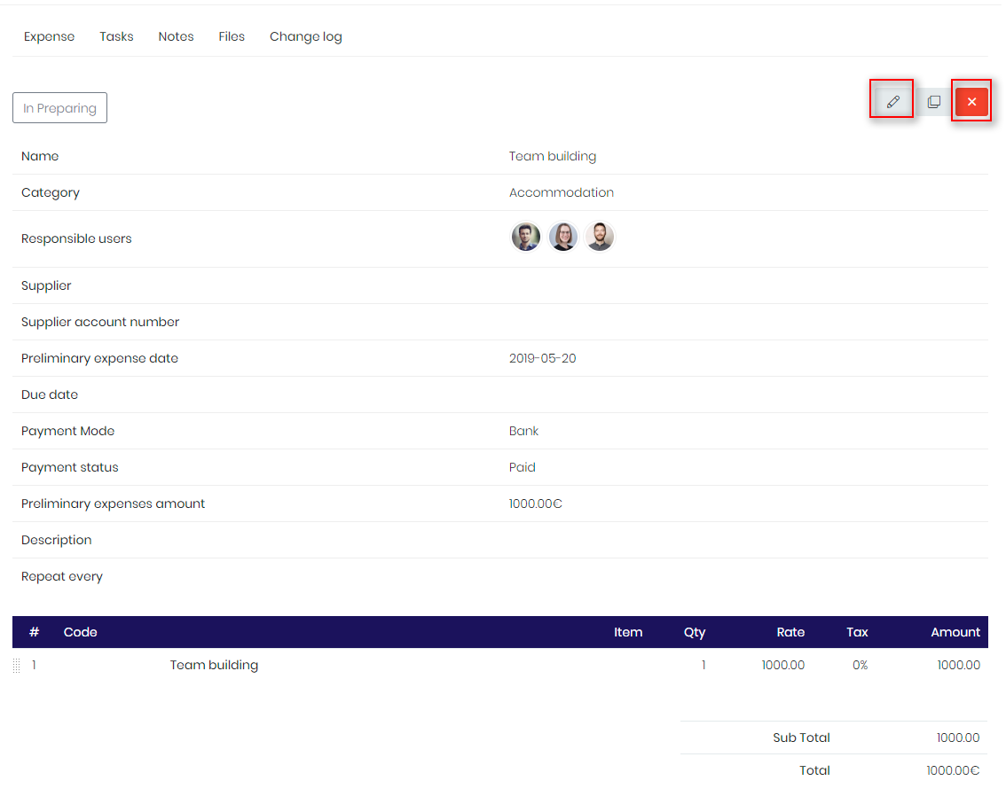 When reviewing expense, use these buttons for deleting or editing:
