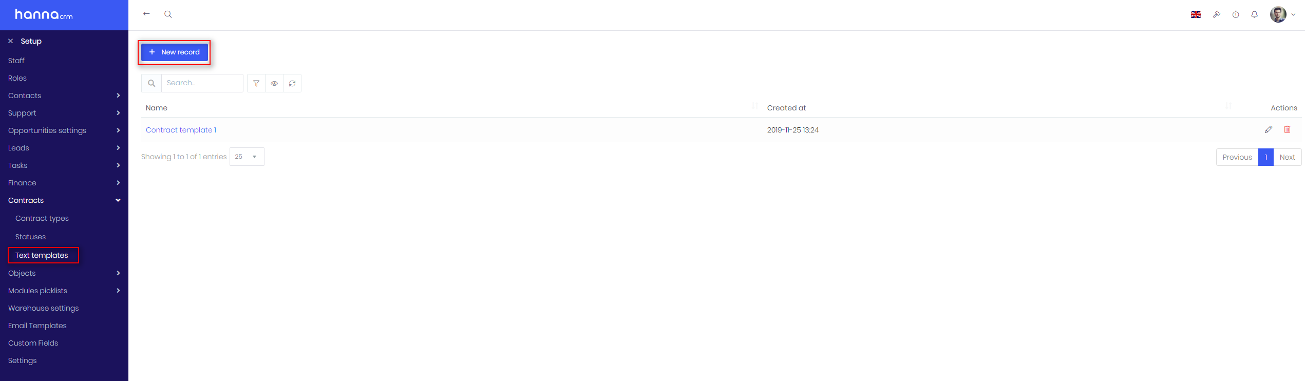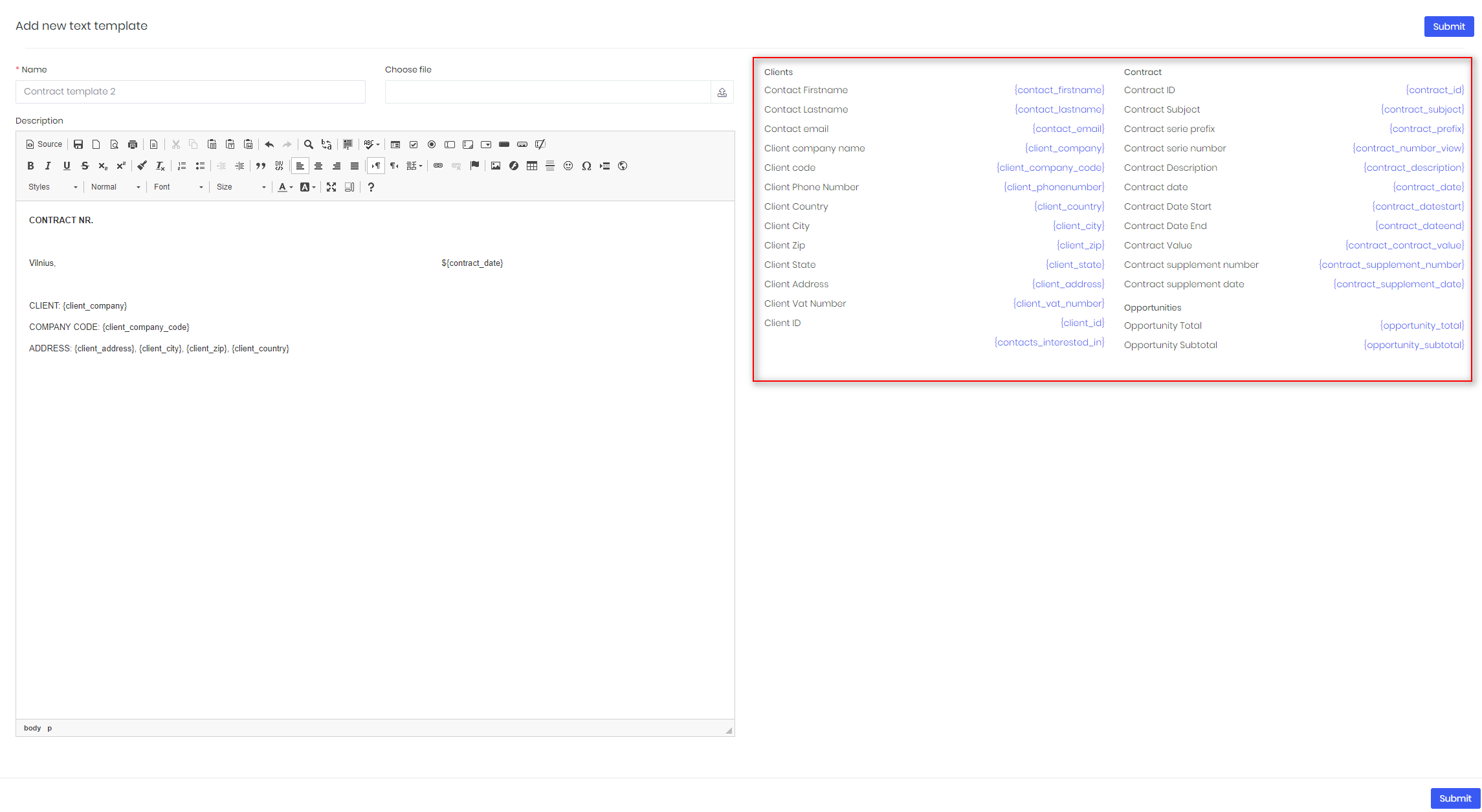 - Save template. Use it when creating new contract in order to generate document.