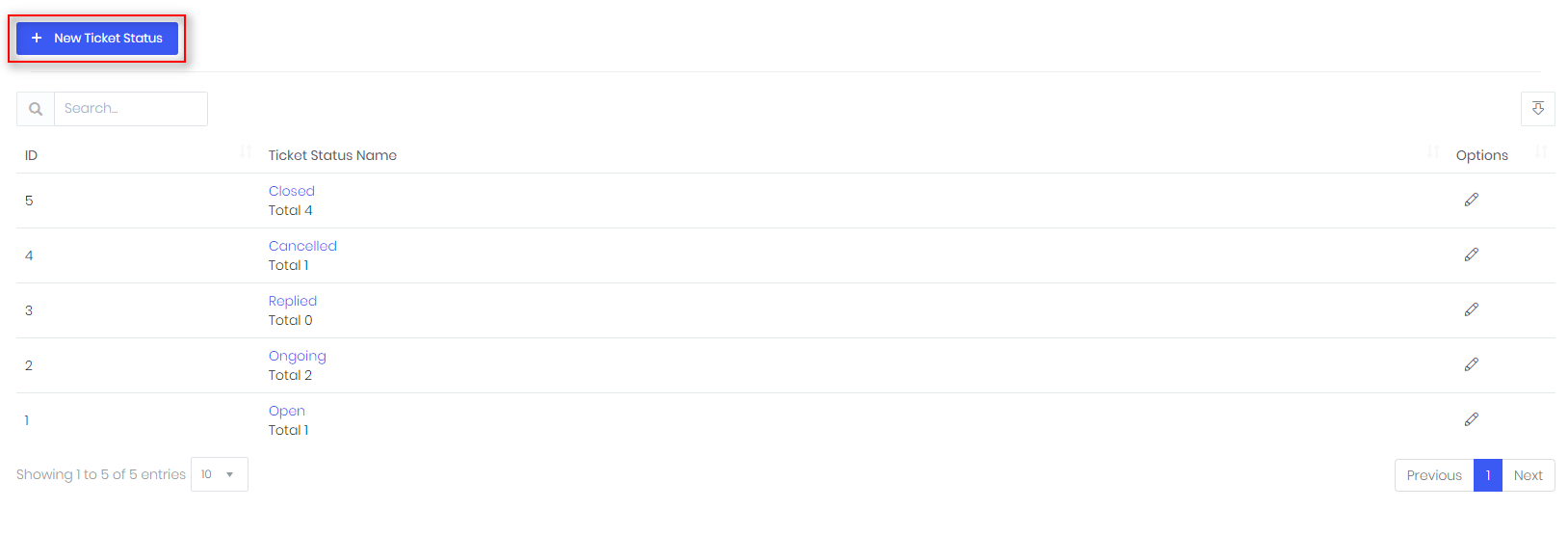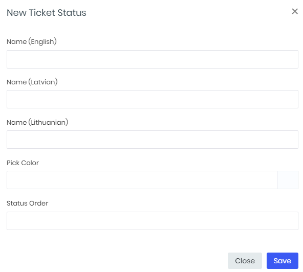 - To create new status, select Setup -> Support -> Ticket statuses and press New ticket status.