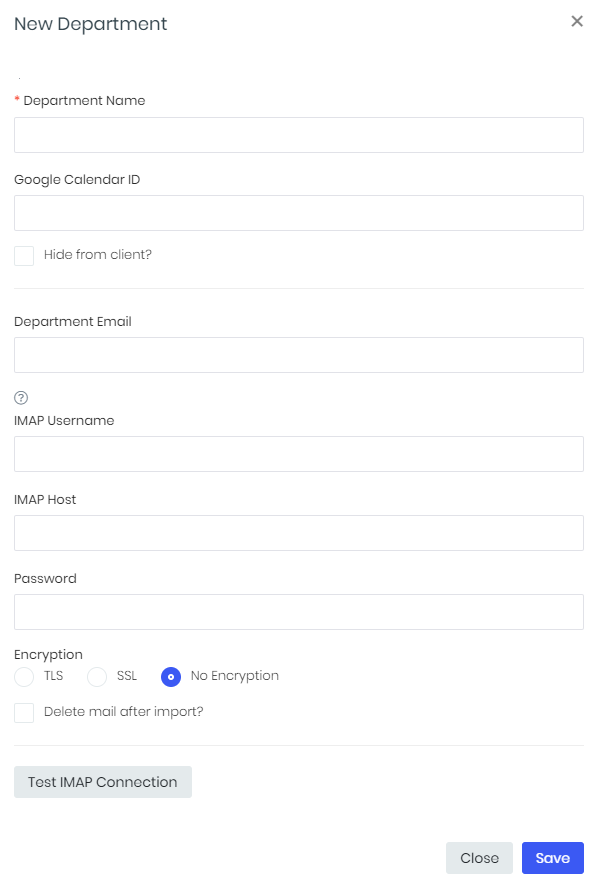 - To enable automatic tickets, indicate Department email, IMAP username, IMAP host, Password, Encryption. It is enough to indicate email at least for one of the departments.
