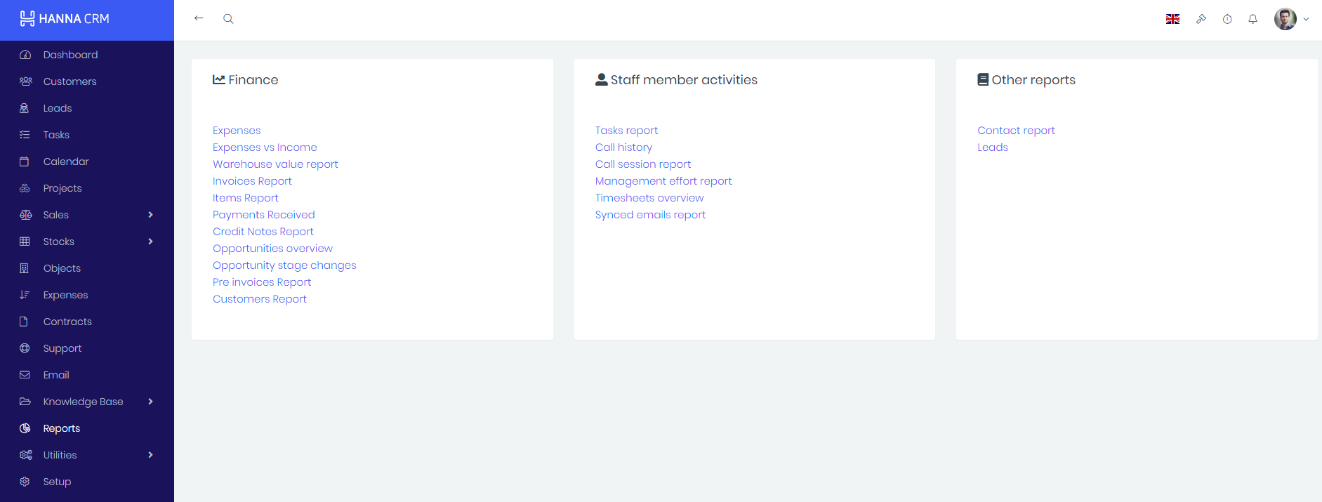 To analyse data in the system, use module Reports. You can analyse Finance, Staff member activities or Other reports.