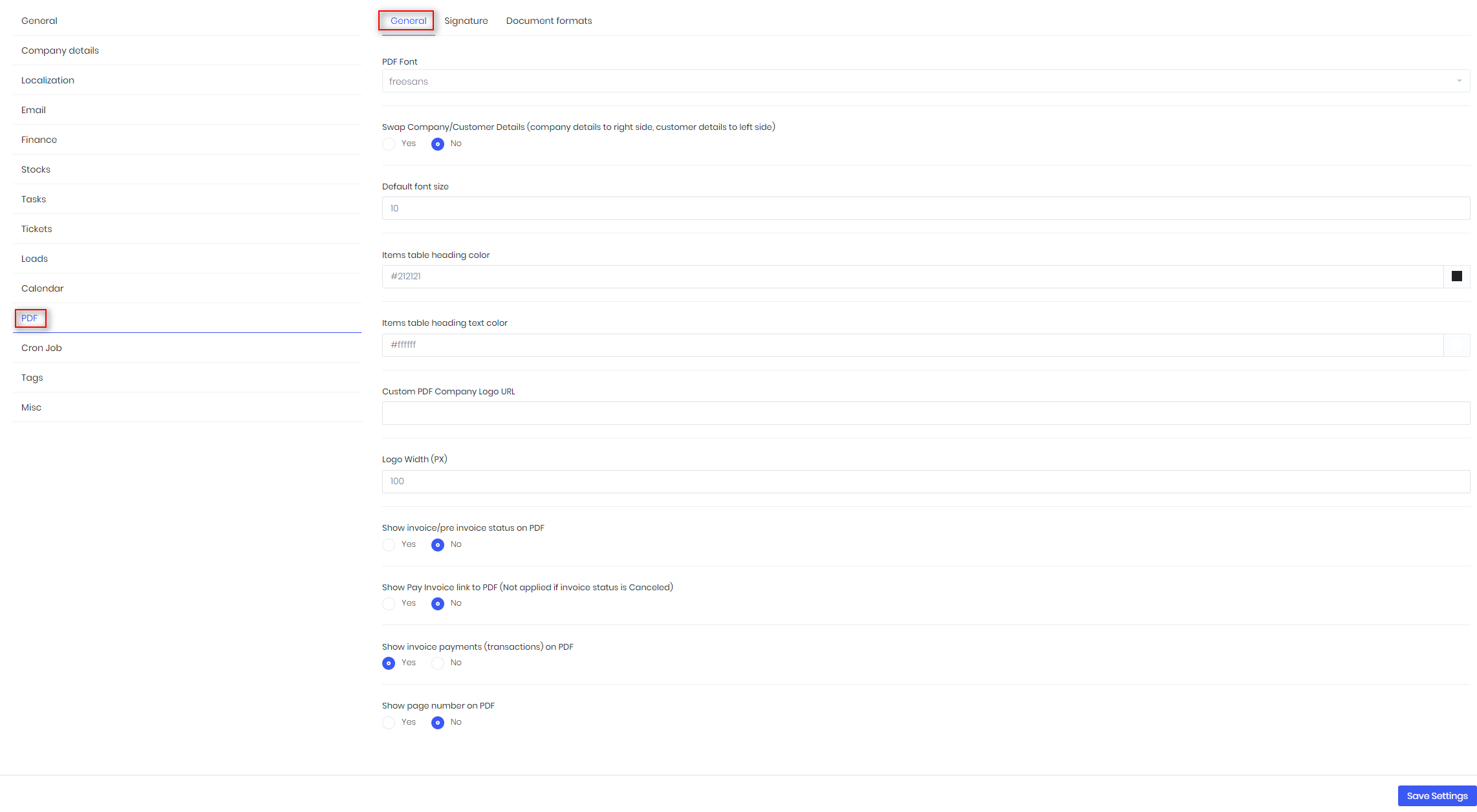 Setup -> Settings -> PDF are settings to indicate parameters for formatting PDF files.