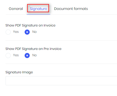 Use Setup -> Settings -> PDF -> Signature to include signature in invoices and pre invoices.