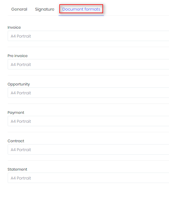 Use Setup -> Settings -> PDF -> Document formats to set document formats.