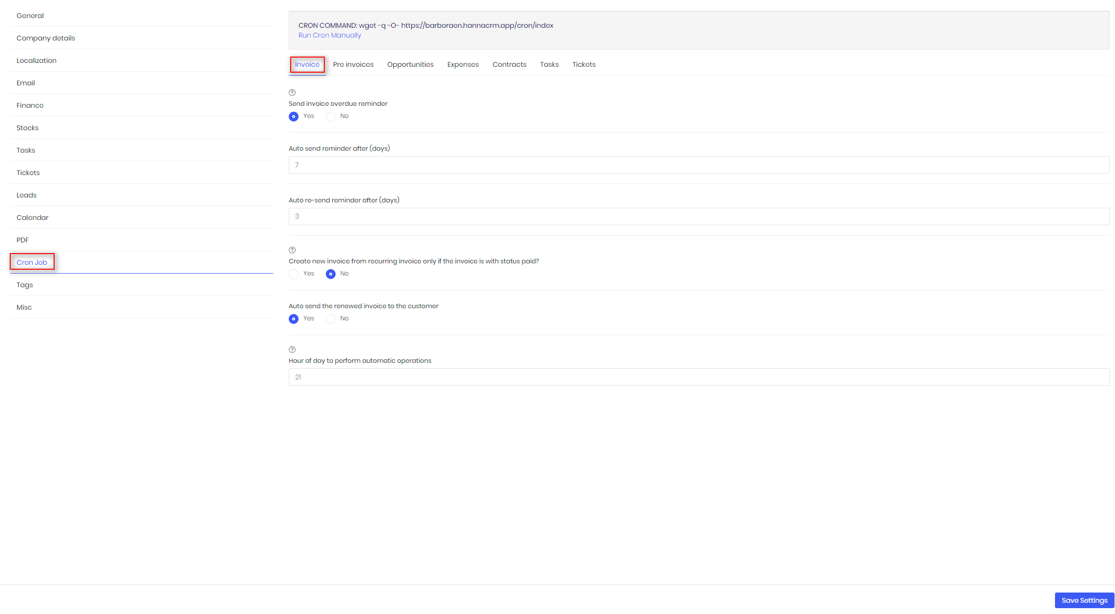 Settings - Cron job