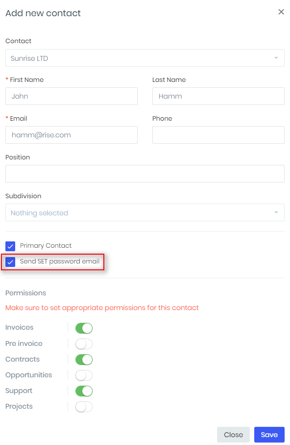 - When creating a new contact or reviewing already entered one, mark Send SET password email. Set permissions, what information contact can reach in Clients zone.