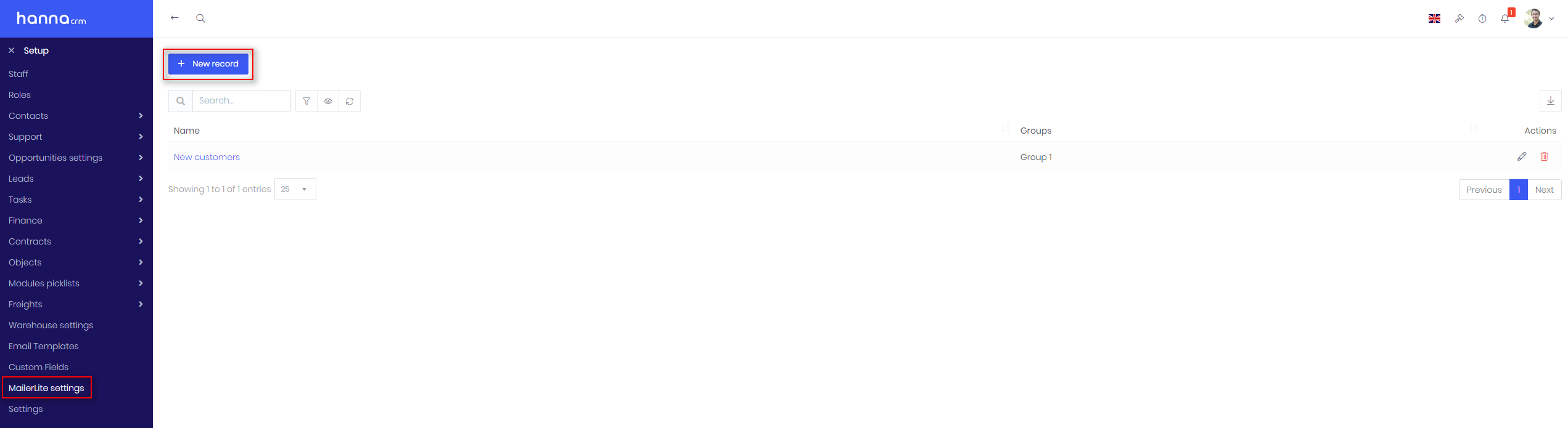Hanna CRM integration with MailerLite