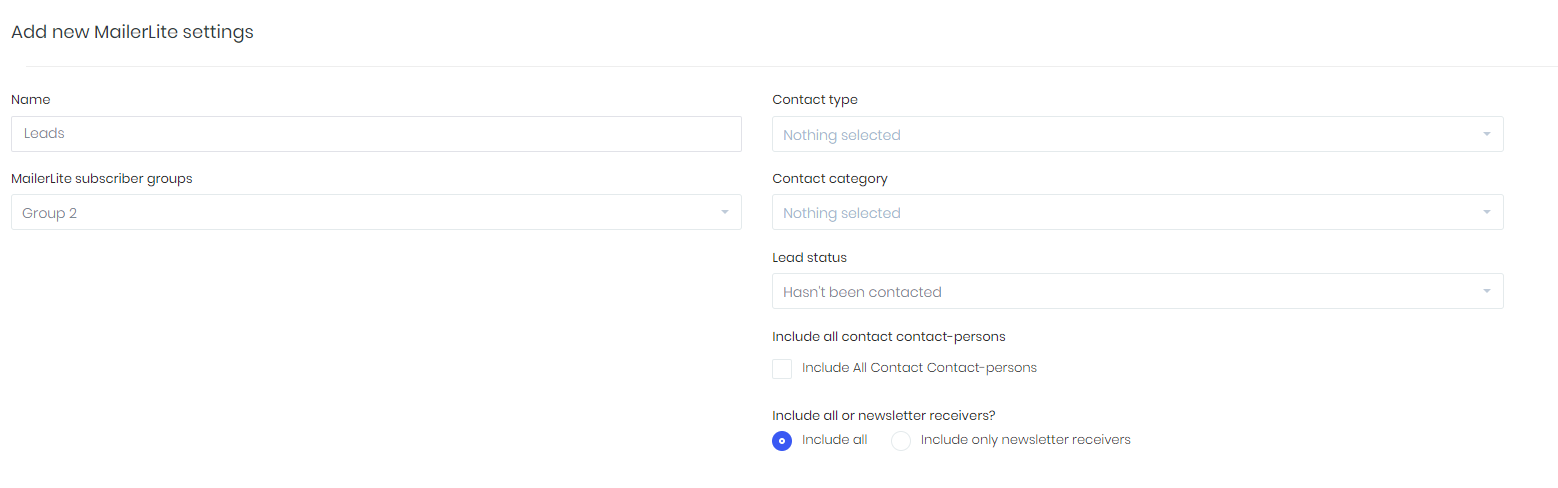 - Enter settings name and indicate MailerLite subscriber group/s. Select criteria (contact type, contact category or lead status) according to which clients will be included into indicated MailerLite subscriber group.