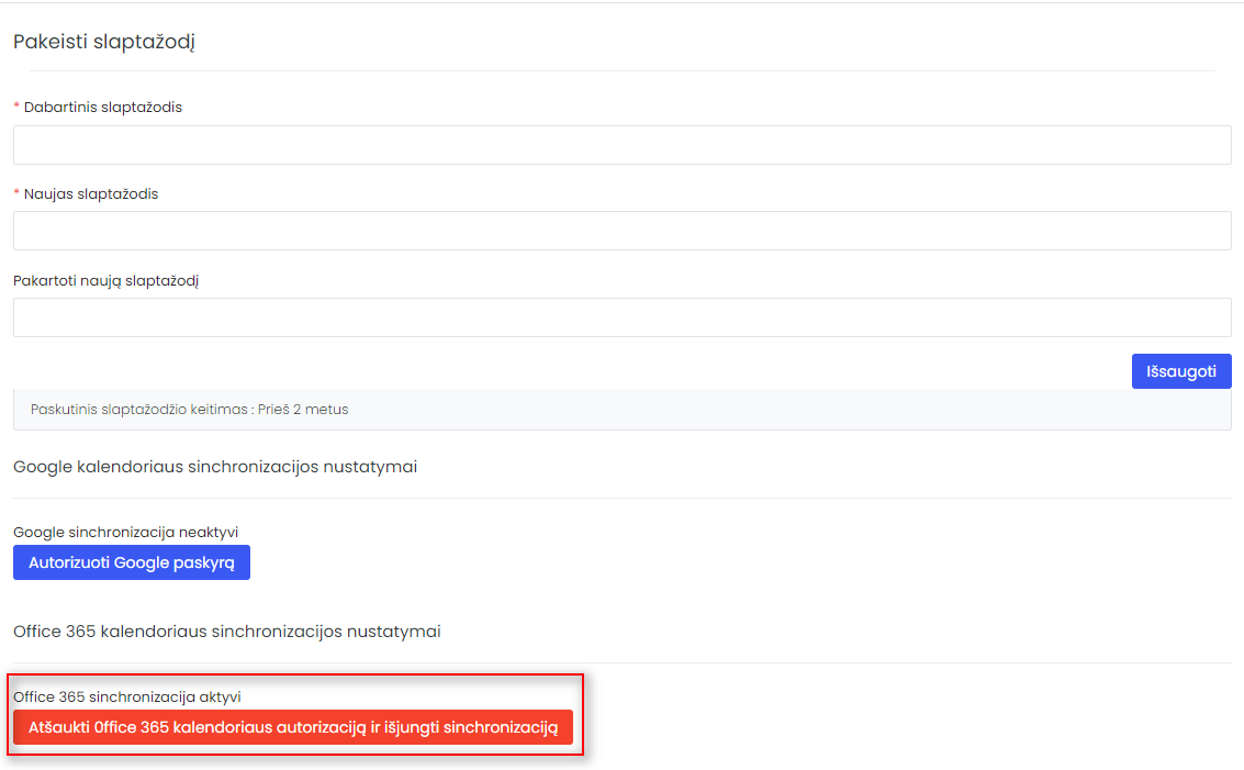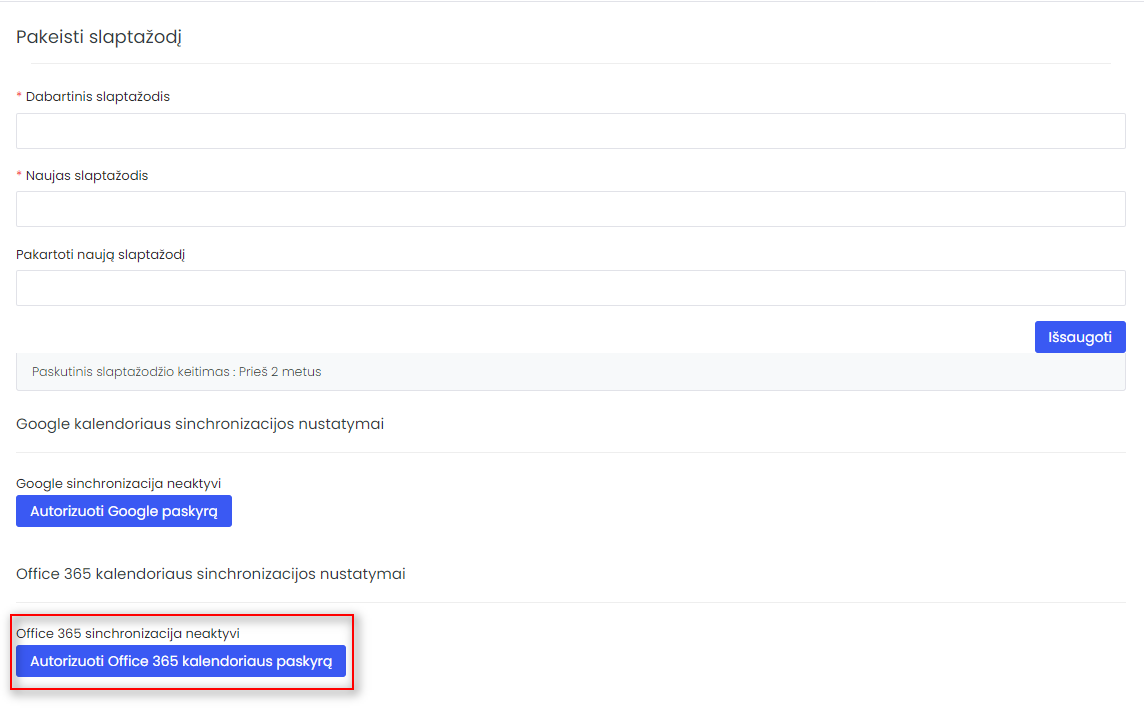 Pasirinkite Office 365 kalendoriaus sinchronizacijos nustatymai ir spauskite Autorizuoti Office 365 kalendoriaus paskyrą: